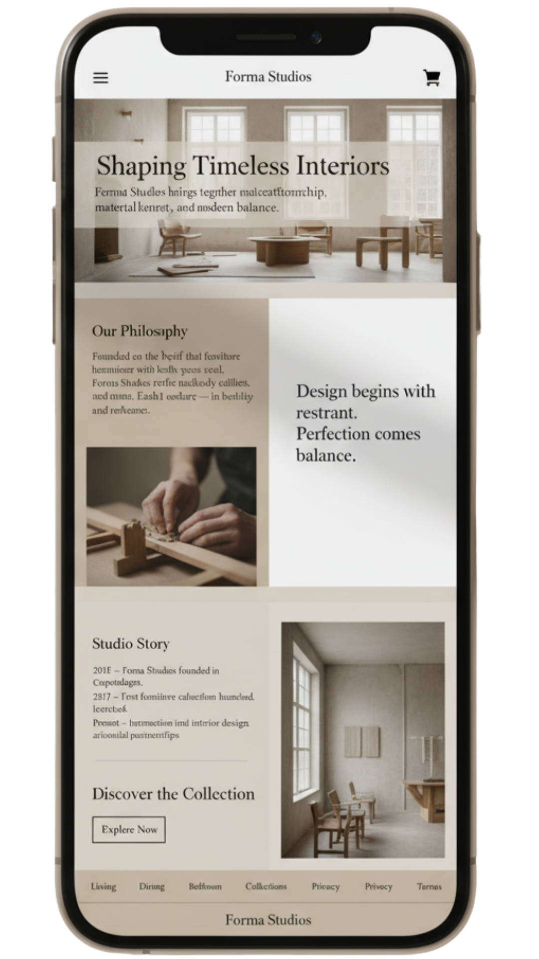 We designed a website that captures the sculptural nature of Forma Studio’s work through balance, proportion, and texture. The layout draws inspiration from architectural composition, allowing photography and material detail to take center stage. The palette blends soft neutrals with warm wood tones and gentle contrast, expressing both modernity and craftsmanship. Typography is understated and elegant, chosen to enhance readability while reinforcing brand sophistication. Every interaction, from hover states to transitions, was designed to feel smooth and tactile, echoing the experience of handcrafted materials.